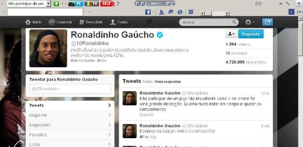 Pelo twitter, no momento em que deveria estar concedendo entrevista, Ronaldinho manifestou a frustração por não ter enfrentado o Internacional. “Não participar de um jogo tão importante como o de ontem foi uma grande decepção. Queria muito estar em campo e ajudar os companheiros”, postou o principal jogador atleticano, que, segundo os próprios companheiros, fez muita falta na derrota para o Internacional, por 3 a 0, no Beira-Rio.